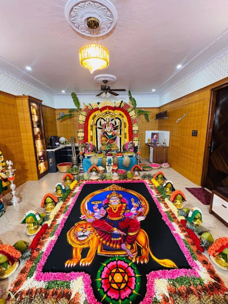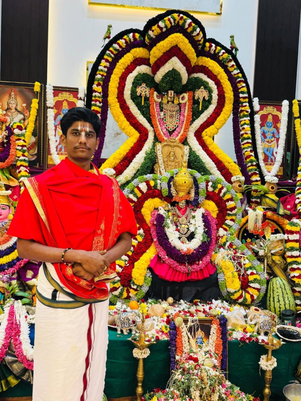 As I grew older, I learned from my father and my gurus, Sridhar Guru and Nagender Guru. They taught me the Vedic path of pourahityam, but also helped me understand the meaning behind it. For me, art and devotion are not separate—whether I’m creating an alankaram, designing a rangoli, or performing a ritual, it feels like a form of seva.