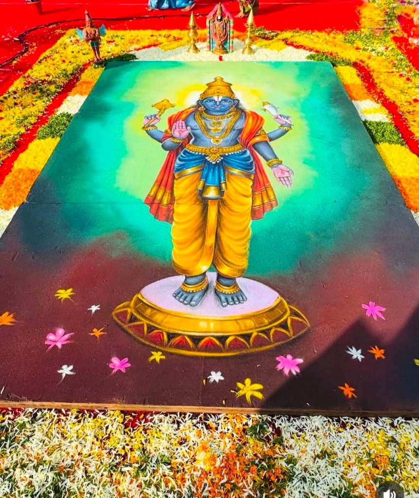 My father is both an artist and a purohith, and I spent my childhood watching him and his team work on alankarams, rangoli, and temple decorations. Over time, I didn’t just observe—I became part of it. I began assisting and eventually started doing alankarams myself, along with sketching and creating rangolis while I was still in school, not as practice, but because I genuinely enjoyed it.