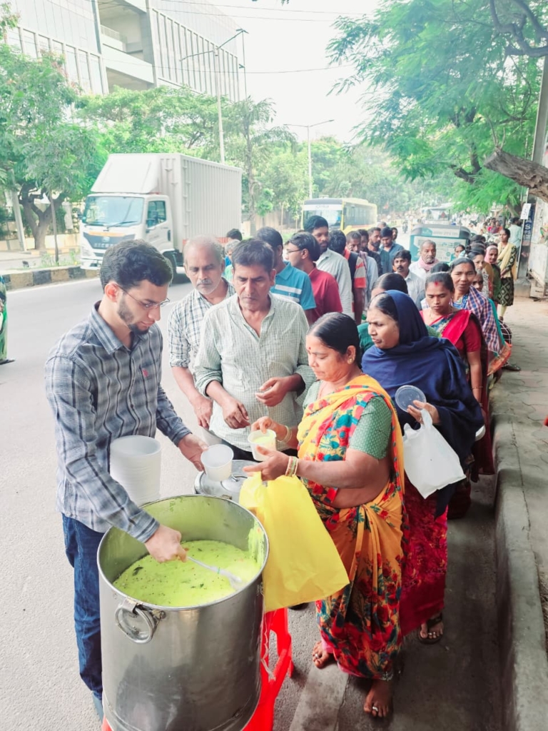 In November 2016, I ordered around 120 plates of upma and went to Niloufer Hospital early in the morning. I was nervous, but within minutes, hundreds of people gathered. Seeing hungry people smile with a plate of food in their hands was unforgettable.