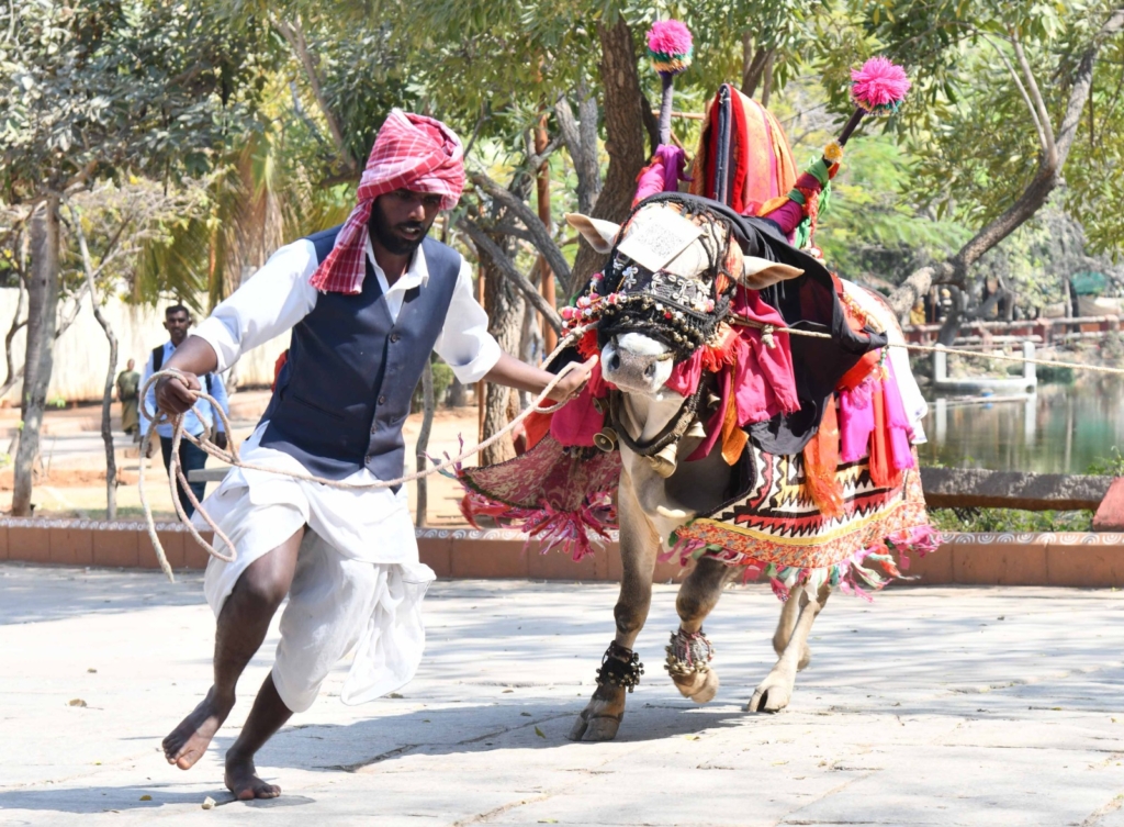 In every village, the Gangireddu — decorated with turmeric, painted horns and flower garlands — leads the procession. Performers sing folk songs rooted in agrarian life: rains, crops, cattle, household well-being. At each doorstep, the bull lowers its head, a gesture families believe brings prosperity for the coming year. In return, households offer rice, grains, vegetables or modest amounts of money.