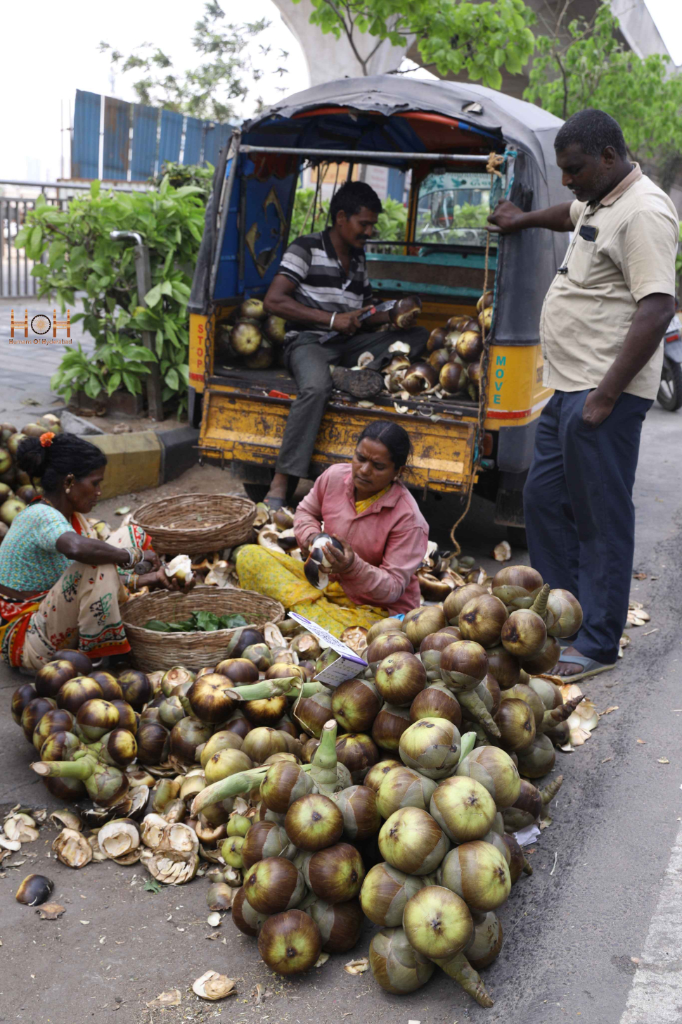 Every year, we come all the way from Machilipatnam for these few months. What you see here on the roadside is only the final part of our work. The real effort begins back home. The men in our family wake up before sunrise and climb palm trees that are nearly sixty feet tall, using nothing but a rope and their bare hands. It’s not just difficult, it’s risky—but that’s how we get these fresh ice apples.